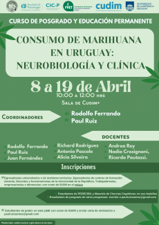 Del 8 al 19 de abril, de 10 a 12 en Sala Cudim*. Se estará dictando el curso de posgrado y formación permanente, coordinado por el Dr. Paul Ruiz y el Dr. Rodolfo Ferrando, con titulo ''Consumo de Marihuana en Uruguay: Neurobiología y Clínica''.