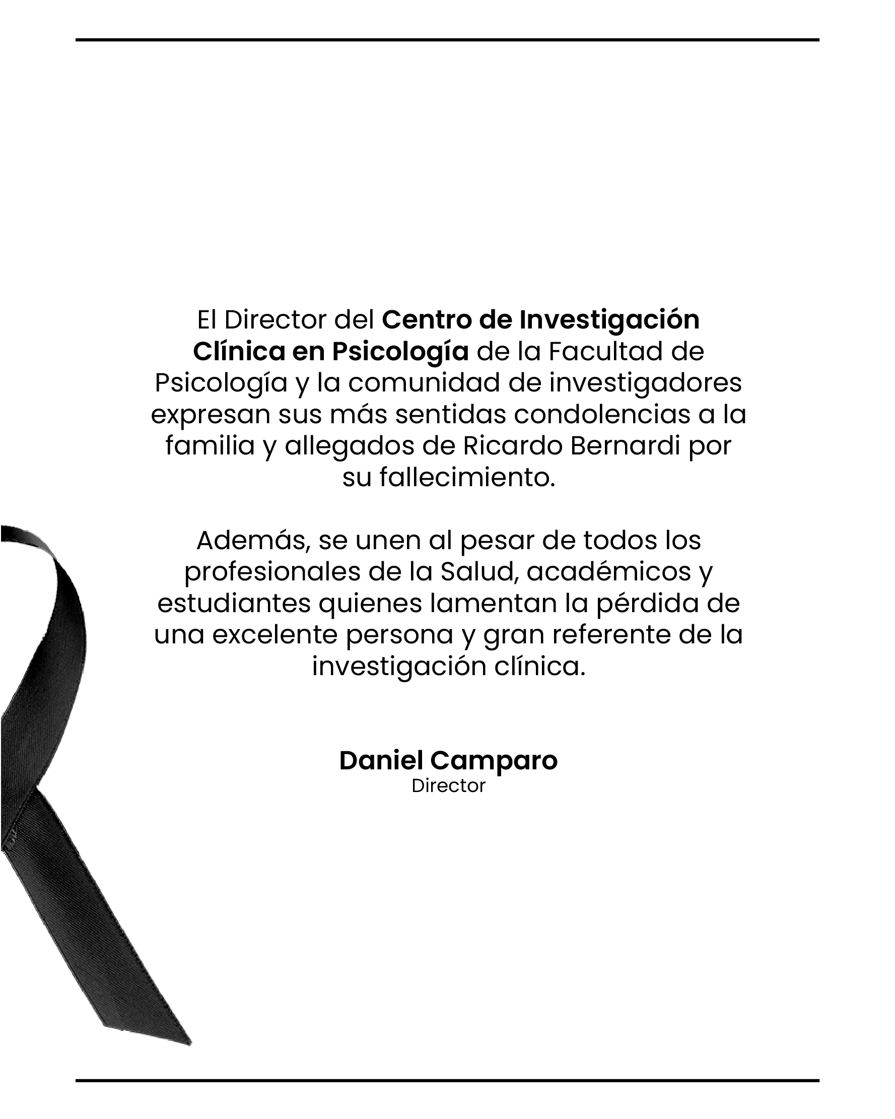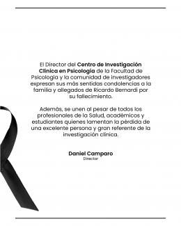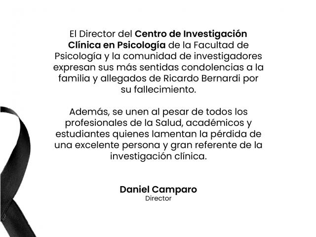 Desde el Centro de Investigación Clínica en Psicología, expresamos las más sinceras condolencias a su familia, en especial a su esposa Beatriz, destacando el afecto, la admiración y el legado que deja en el campo de la salud mental, a sus amistades y personas cercanas.