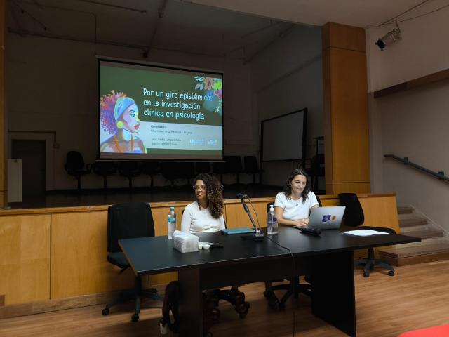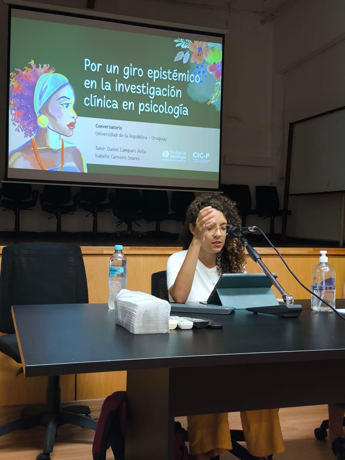 El conversatorio Por un giro epistémico en la investigación clínica en psicología se realizó el 15 de diciembre en el Salón de Actos “Élida Tuana” de la Facultad de Psicología de la Universidad de la República (Udelar). La actividad se enmarcó en una propuesta de reflexión sobre los límites del conocimiento psicológico tradicional y la necesidad de incorporar otras cosmogonías en la clínica. Fue moderada por la investigadora del Centro de Investigación Clínica en Psicología (CIC-P), Ofelia Ros, y contó como ponente con Isabelle Carneiro, actriz y psicóloga brasileña, estudiante de maestría en la Universidad de São Paulo, quien compartió avances de su investigación sobre raza, colonialidad y producción de conocimiento en psicología clínica.