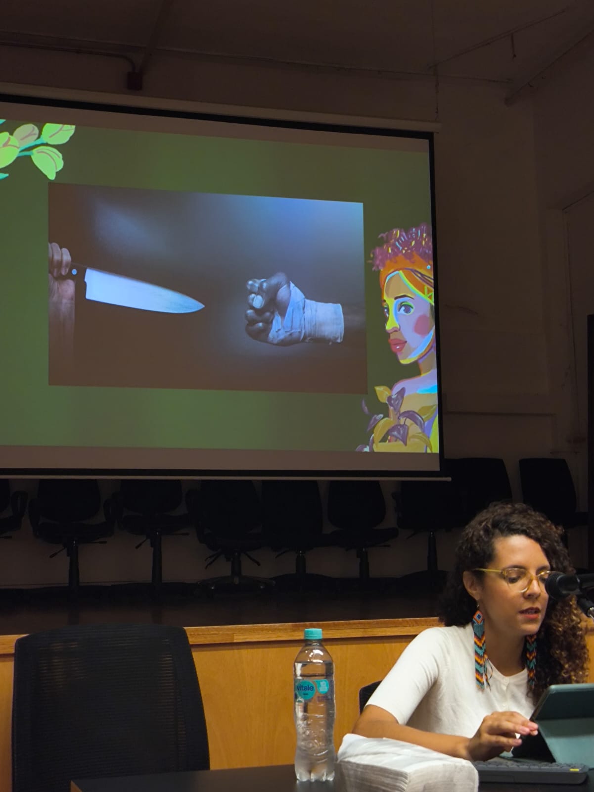 Isabelle Carneiro inició su intervención presentándose desde su genealogía y su ancestralidad, como un gesto político y epistemológico. Nombró a sus antepasados para evidenciar la mezcla, la violencia colonial y el borrado histórico que atravesaron las poblaciones negras e indígenas en Brasil. Señaló que no existía una “pureza” ancestral posible y afirmó: “no somos mitades ni partes unidas, somos enteros”. Desde allí, explicitó la perspectiva desde la cual pensó su investigación y su práctica clínica.